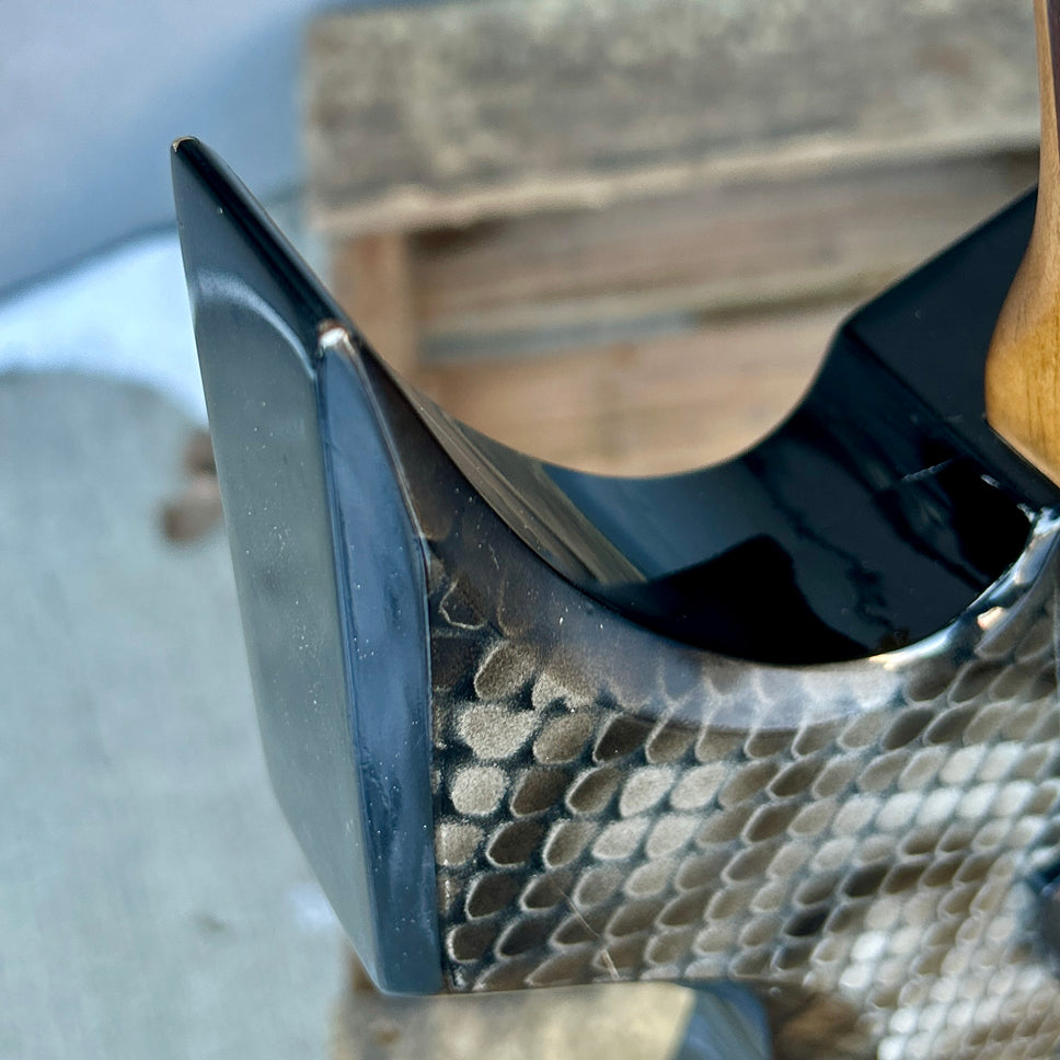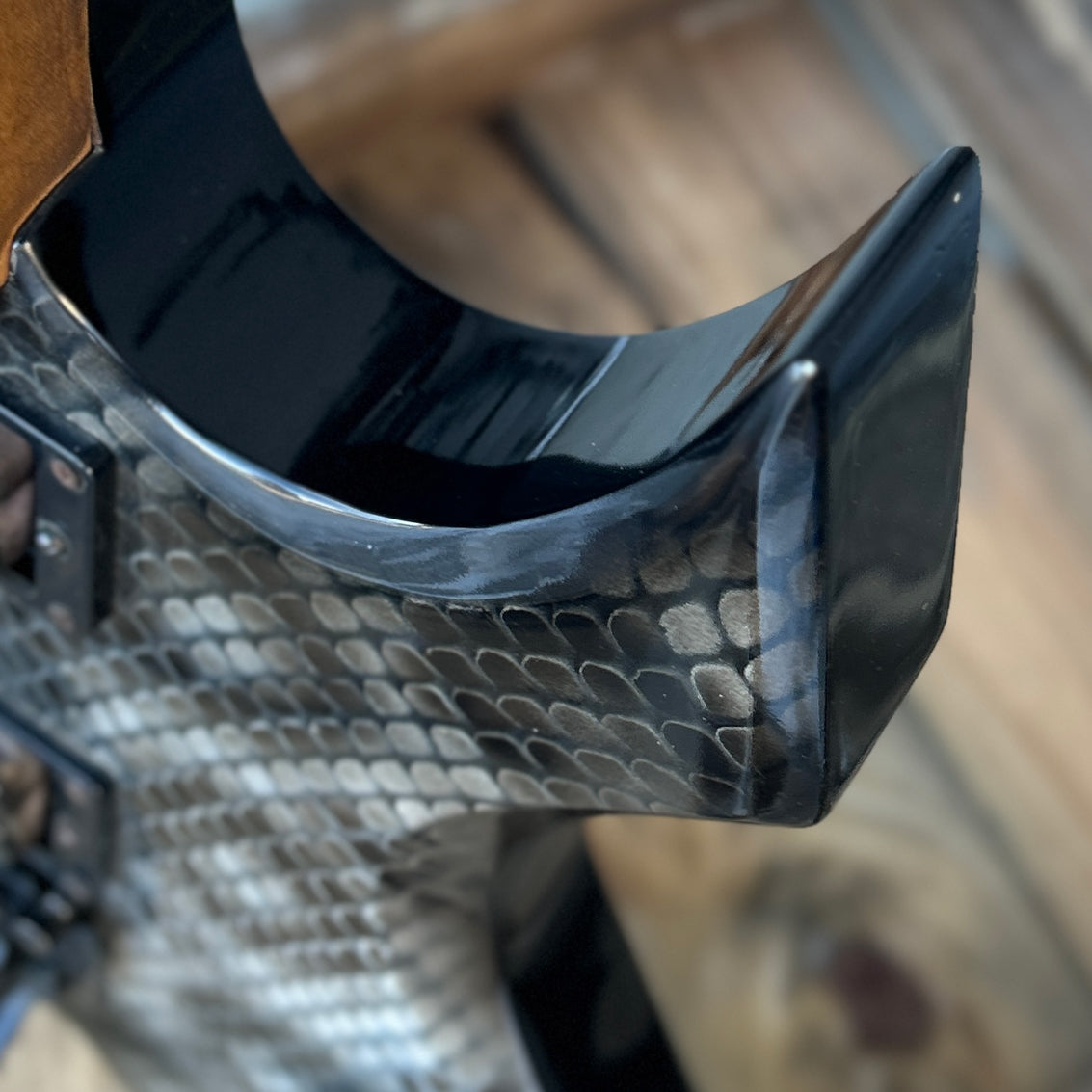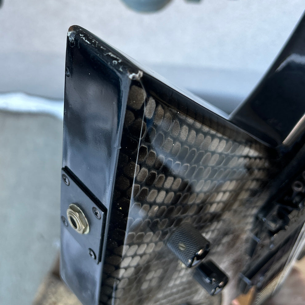 Dan Lawrence hand painted Snake finish. Heavily used with lots of small dents/dings/chips/nicks/scratches. Buckle rash on back . Have done best to accurately represent condition in the pictures. Appears that backplate and end pins have been replaced, appears all original otherwise. Well setup with good playability. Includes hardshell case with wear but fully functional. Guitar weighs 8 lbs 7 oz.