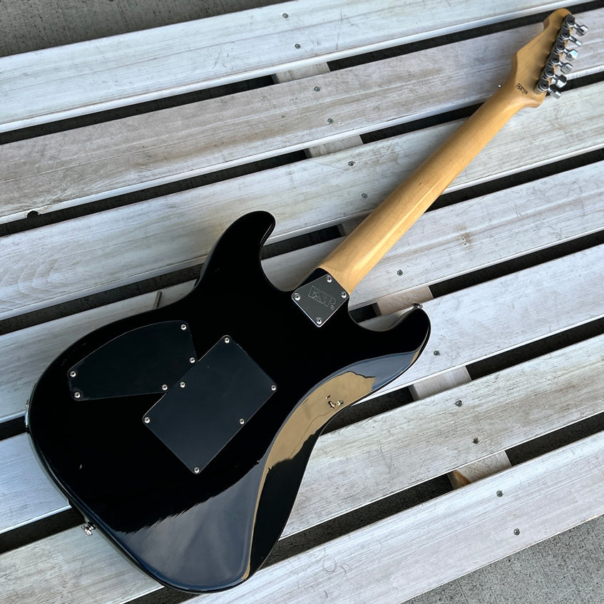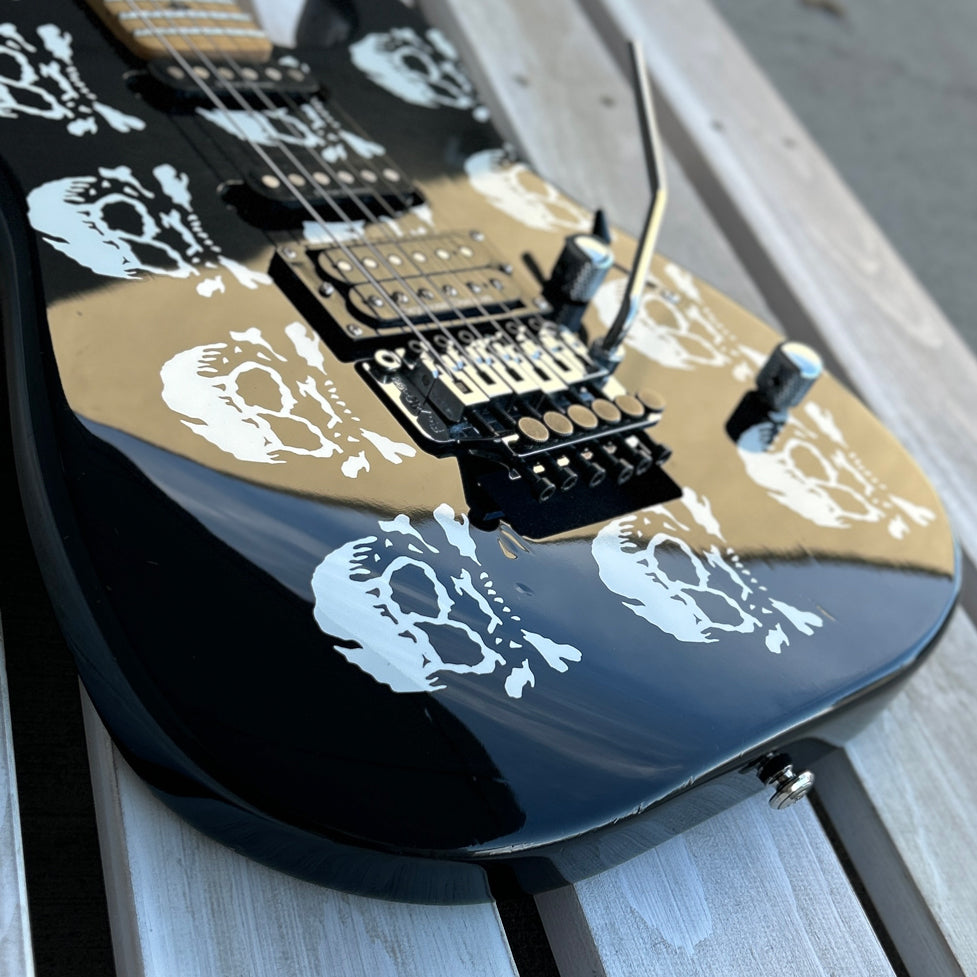 Guitar features/specs include Seymour Duncan (JB bridge) pickup/Duncan Designed SC101 (middle and neck) pickups, Floyd Rose trem, Sperzel locking tuners, alder body, maple fingerboard, and distinctive skulls finish.