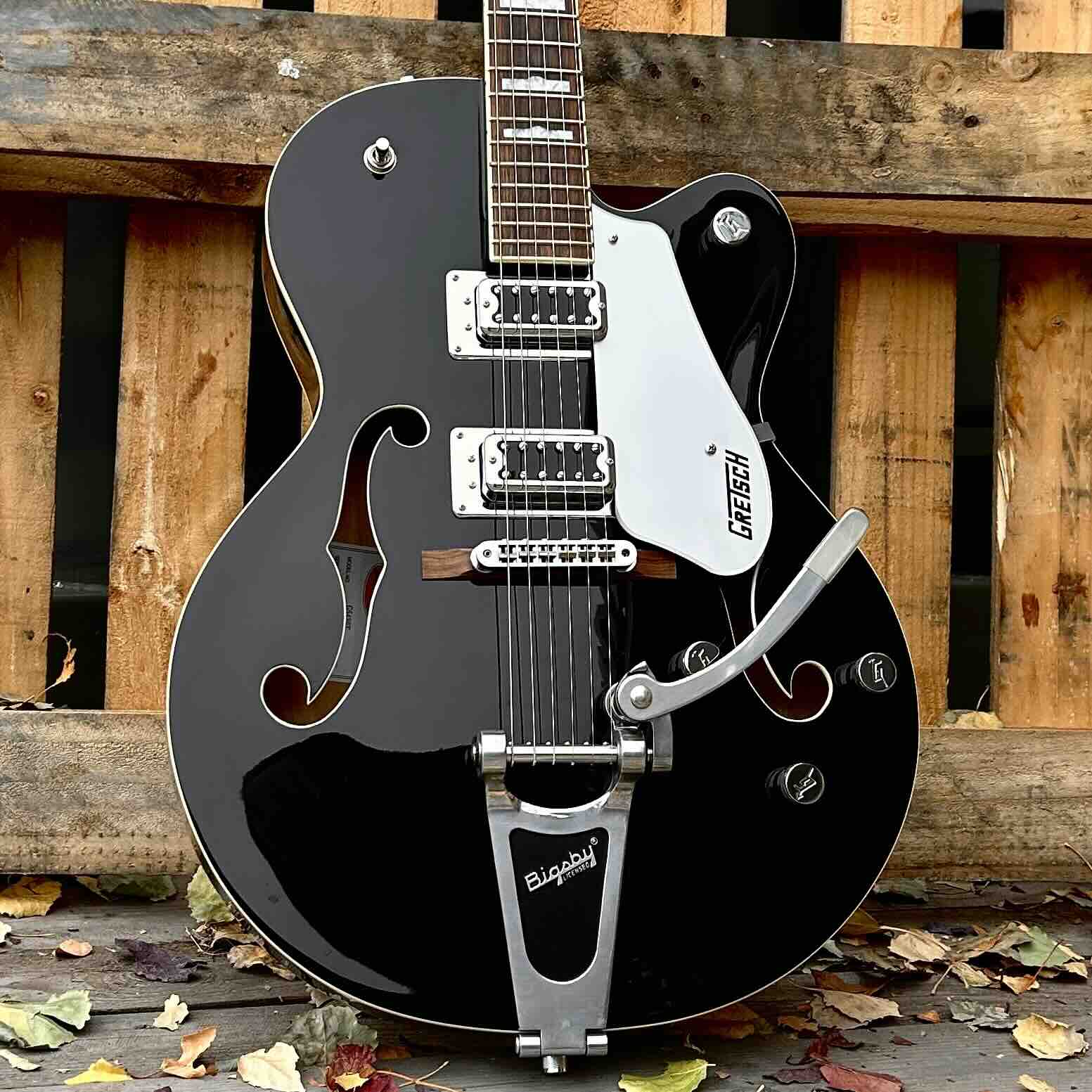 Body: Single cutaway double-bound hollow body in Orange finish. Raised silver plexi pickguard with Gretsch logo. Pinned adjusto-matic bridge with rosewood bas. . . Read More
