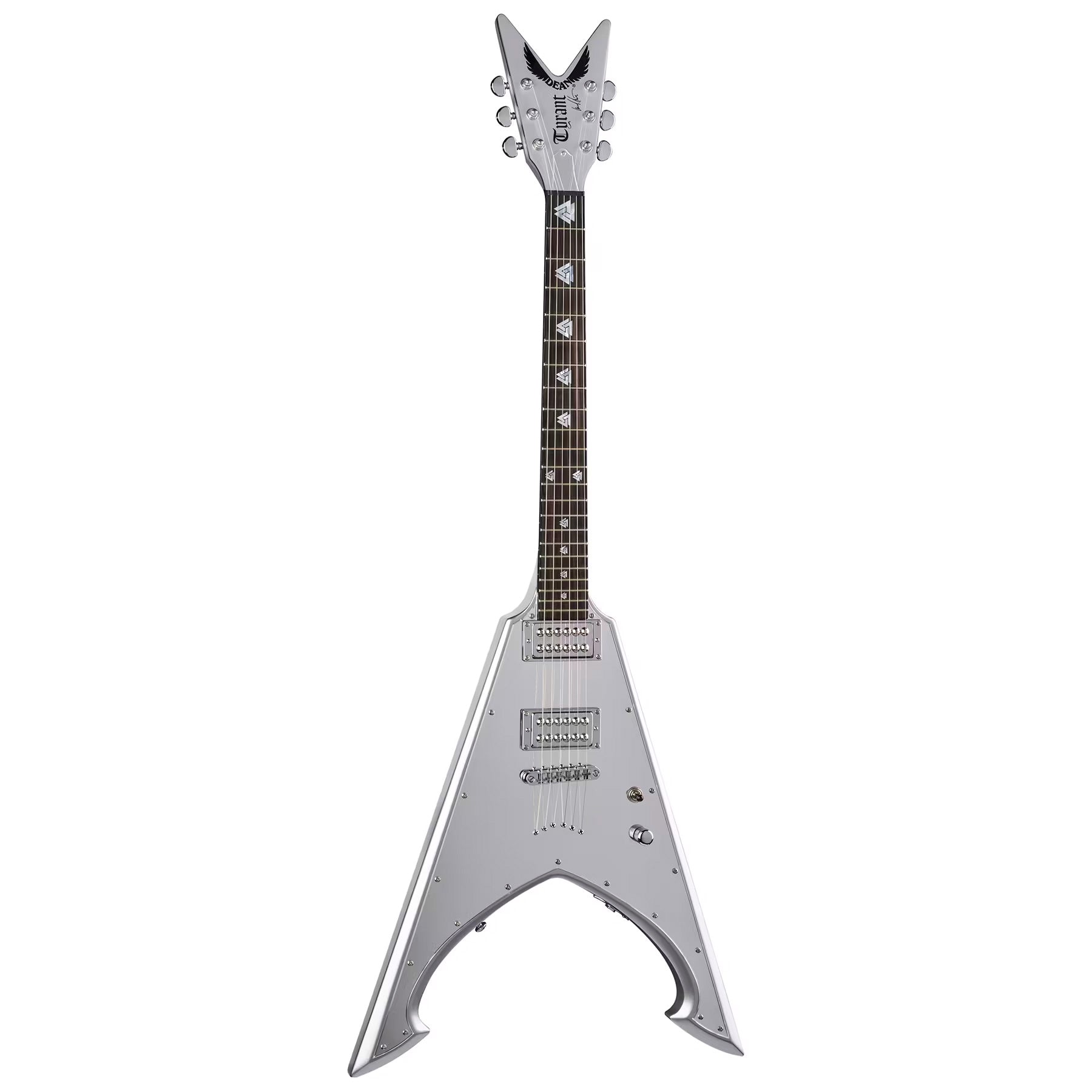 No holding back here. This is the professional grade version of Michael's Chrome Tyrant that won't destroy your wallet. Metallic Silver finish with a full top mirror pickguard demands respect for anyone playing this beast. Loaded with a USA DMT Tyrant bridge pickup and a USA DMT Time Capsule in the neck, this guitar brings all the tones one will need for high gain metal to creamy leads and soft clean tones. Ebony Fingerboard with custom Valknut pearl inlays leaving no stone unturned.Read More